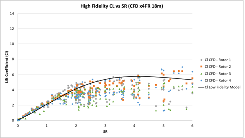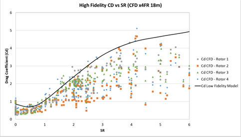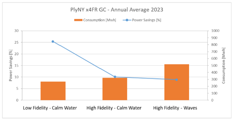 The value of this approach becomes clear when comparing low-fidelity (LF) and high-fidelity (HF) modelling for WASP aero performance. In our Ecoliner case study, fitted with two and four Flettner Rotors, the LF models were based on literature lift and drag coefficients, isolated rotor performance (plus hull and superstructure aero drag). Device-device and hull-device interaction effects were not considered to highlight the differences when these effects are not included in lower fidelity approaches.