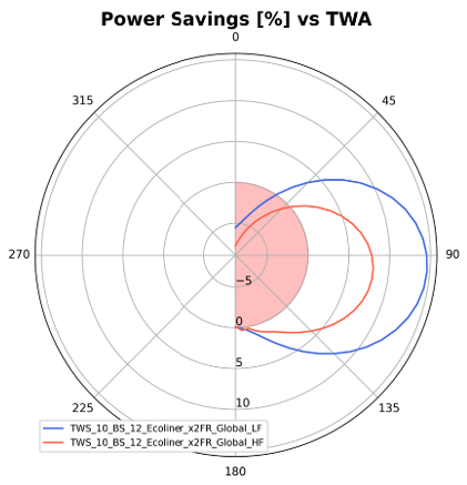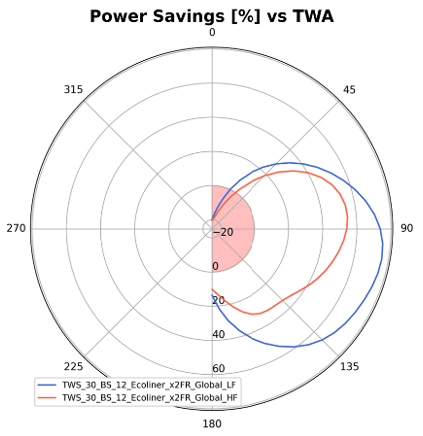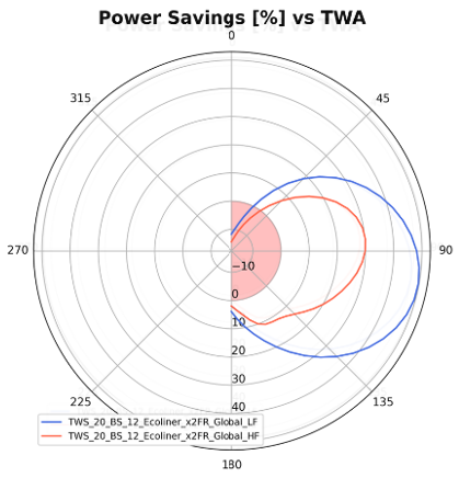 Performance prediction begins with the creation of polars, graphs mapping power or thrust versus sailing conditions (boat speed and true wind speed and angle). These polars are generally computed within a Velocity Prediction Program (VPP) that accepts arbitrary interpolation models as input. These models interpolate all the ship component’s forces and moments for any sailing and attitude condition in the optimization domain. The sailing conditions are parametrically swept so that the balance is optimized on each possible point of the power consumption polar. This polar represents the best predicted equilibrium solution, including the WASP devices’ trim controls that can be achieved at each sailing condition.