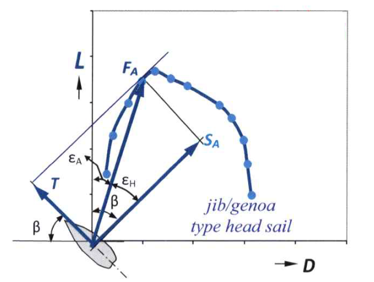 On a CL — CD polar plot, each point on the curve corresponds to a specific angle of attack, and the straight line drawn from the origin to that point represents the total aerodynamic force vector FA for that setting. The angle β represents the apparent wind angle.