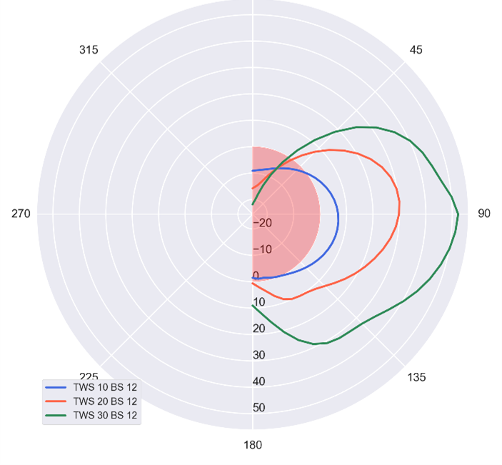 This is the fundamental aerodynamic “potential” of the device, independent of ship dynamics, and each wind propulsion device has its own polar shape depending on its aerodynamic characteristics. However, ships operate within complex hydrodynamic environments. So, once aerodynamic forces are computed, they are embedded into Velocity Prediction Programs (VPPs) that solve the force equilibrium between wind propulsion devices and the vessel’s hydrodynamics across a range of Apparent Wind Angles (AWA) and speeds.