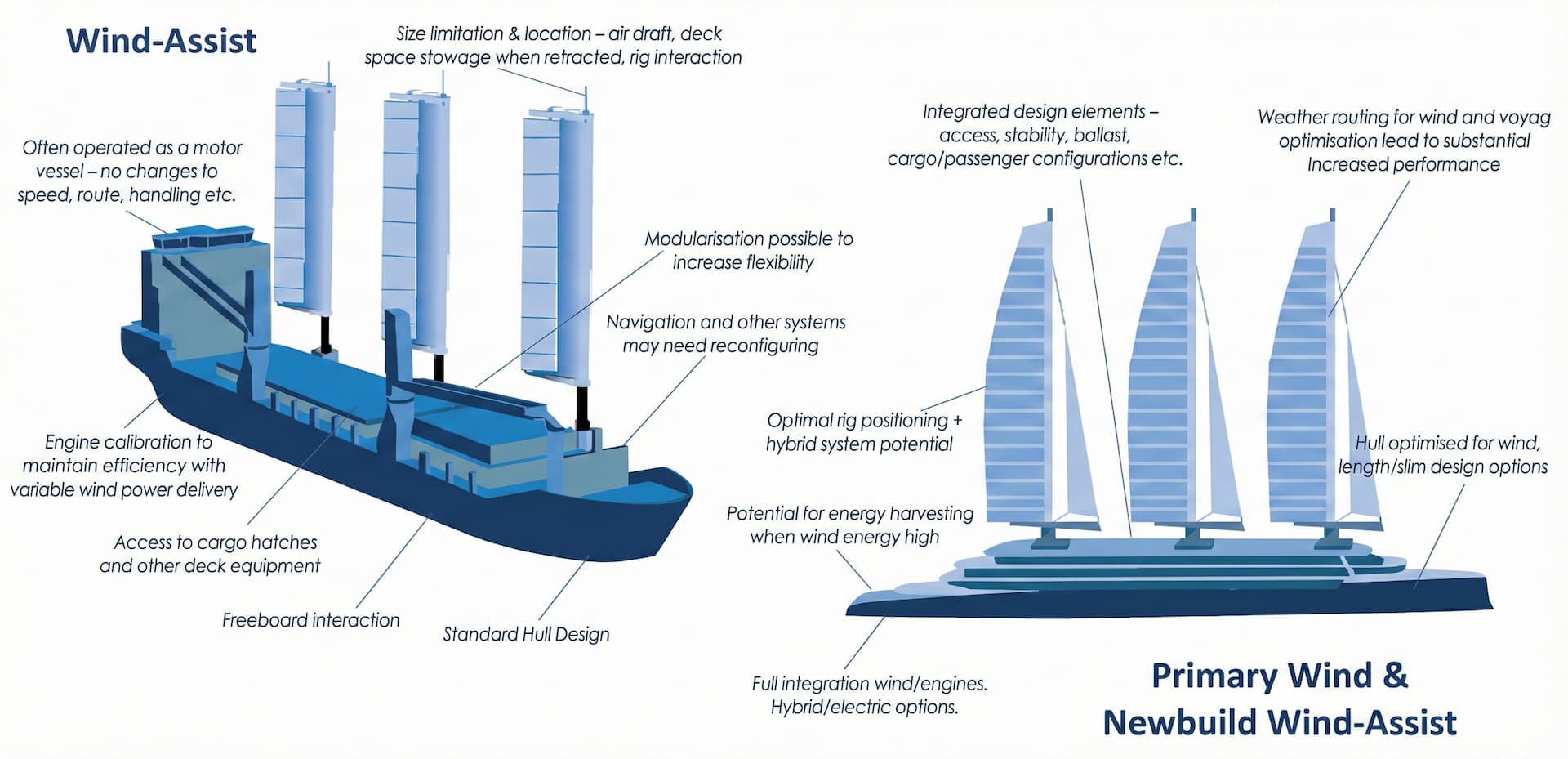 Each system generates thrust through the interaction of lift and drag forces, but the way these forces are produced and controlled defines their efficiency, power demand, and operational use. At the end, each technology presents distinct trade-offs in terms of aerodynamic efficiency, control complexity, and integration feasibility. The choice of system ultimately depends on vessel type, operational profile, and desired balance between capital investment, energy savings, and regulatory compliance.